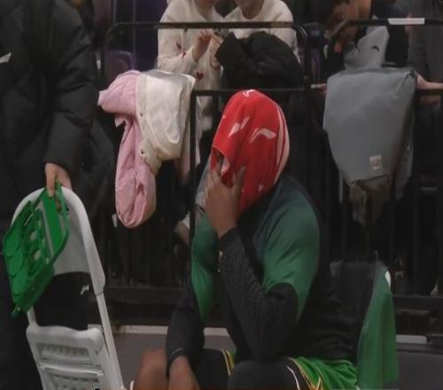 接下来镜头再对准了威尔斯,心情糟糕透顶的威尔斯全程低着头不说话,扯下了发带,还用毛巾把脸给捂住了,应该真哭了。