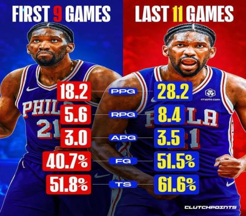 而在本场比赛低迷之前,恩比德已经连续11场交出高光表现,期间场均数据飙升至28.2.分8.4板3.5助,命中率也提升至51.5%,真实命中率61.6%。