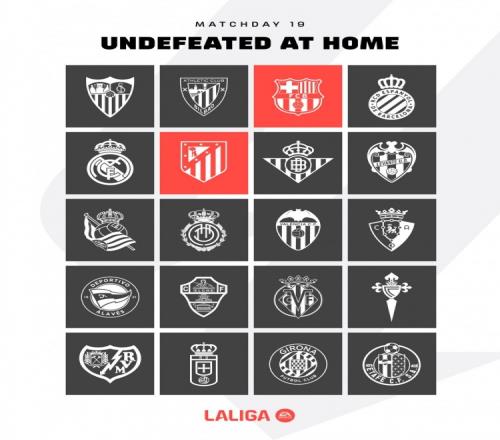体育播报1月15日宣 据西甲官方统计,巴萨和马竞是本赛季仅有的两支西甲主场不败球队。