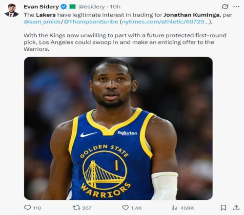 NBA记者埃文-斯迪瑞透露一个对湖人有利的消息,因为国王连一个受保护的首轮签都不肯给勇士所以国王、勇士的谈判也陷入僵局,而且勇士不愿意接手蒙克的合同。