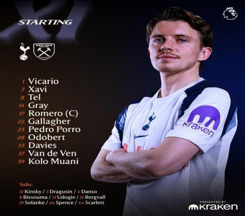 托特纳姆热刺首发:1-维卡里奥、23-波罗、33-本-戴维斯、37-范德芬、17-克里斯蒂安-罗梅罗、14-阿奇-格雷、22-加拉格尔、7-哈维-西蒙斯、11-马蒂斯-特尔、28-奥多贝尔、39-穆阿尼