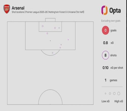 Opta统计,阿森纳在上半场对诺丁汉森林的比赛中有8脚射门,但没有一脚射正,这是2019年12月阿尔特塔上任后执教的首场英超比赛以来(对伯恩茅斯,上半场9次射门),上半场射门次数最多但没有1次射正的情况(只算英超比赛)。