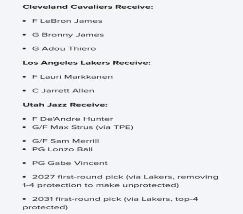 今日,知名体育媒体Bleacher Report抛出了一套极具冲击力的方案,詹姆斯三方交易,湖人、骑士、爵士全员上桌,交易细节如下: