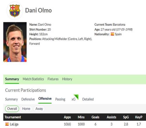 本赛季至今,奥尔莫西甲10次先发6次替补,踢了1000分钟,贡献了6球3助攻,差不多每110分钟就能参与一个进球,这个效率还是很高的。