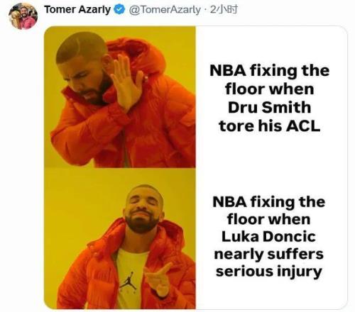 快船记者Tomer Azarly晒图讽刺:“德鲁·史密斯十字韧带撕裂?NBA:不想修。卢卡·东契奇差点就受伤了?NBA:必须修好!”
