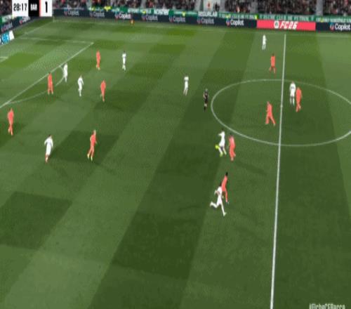 第42分钟,费尔明包抄近距离打门,皮球高出横梁