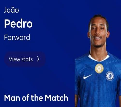 英超第24轮,切尔西主场3-2逆转击败西汉姆联,此役替补登场传射建功的切尔西前锋若昂-佩德罗当选全场最佳球员。