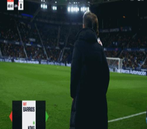 第49分钟,马竞换人调整,科克上场替换巴勃罗-巴里奥斯