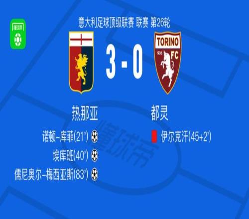 北京时间2月22日意大利足球甲级联赛第26轮,热那亚主场对阵都灵。比赛中诺顿-库菲、埃库班、儒尼奥尔-梅西亚斯先后为热那亚破门,都灵球员伊尔克汗在比赛过程中吃到红牌。最终热那亚以3-0的比分战胜都灵。