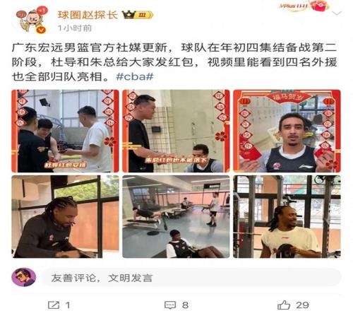 广东宏远俱乐部官方发布球队集结动态,大年初四集结备战第二阶段,杜锋和朱芳雨给大家发红包,萨林杰、奎因、麦考尔全部归队!