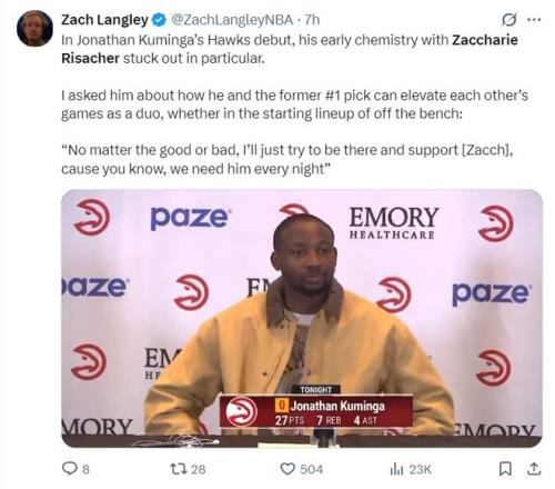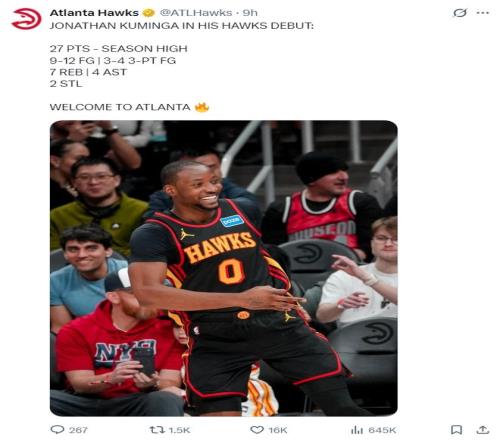 这场比赛是乔纳森-库明加老鹰生涯的首秀,此前勇士用库明加+希尔德换走了波尔津吉斯,此役库明加全场比赛24分钟,12中9,三分4中3,罚球7中6,拿到27分7篮板4助攻2抢断,命中率75%,三分命中率75%,真实命中率89.5%,正负值+16。
