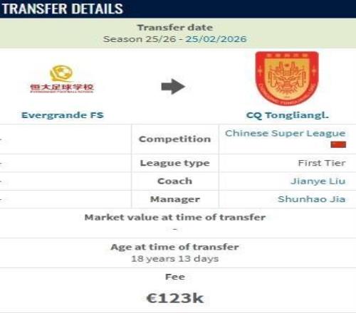 德转显示,重庆铜梁龙从恒大足球学校签下18岁中场刘佳乐花费约100万人民币。