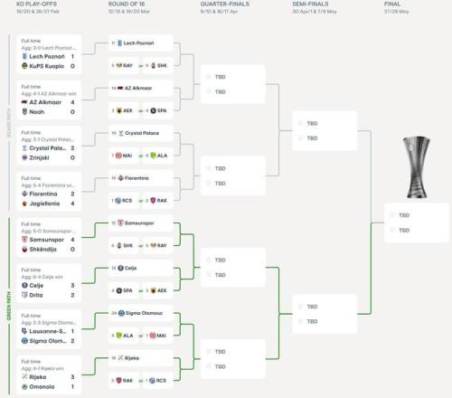 北京时间2月27日,本赛季欧协联淘汰赛附加赛的比赛已全部结束。在两回合较量后,采列、佛罗伦萨、里耶卡、萨姆松体育、水晶宫、奥洛莫茨、阿尔克马尔、波兹南莱赫八家俱乐部最终闯进淘汰赛。