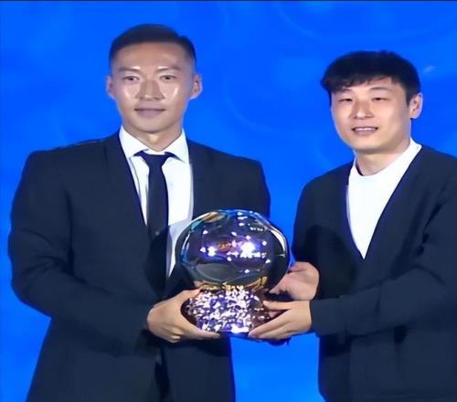 这是他继2020年之后,职业生涯第二次捧起中国金球奖,颁奖台上,为他颁奖的,是多年的国家队战友武磊。