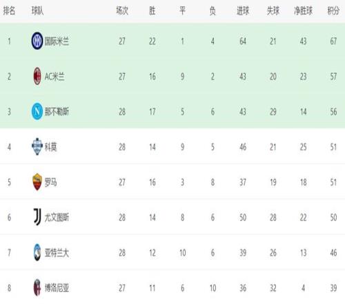 在积分榜上,国际米兰依然遥遥领先,以67分高居榜首,战绩是22胜1平4负。排名第2的是AC米兰,只拿到57分,足足落后10分。显然,意甲的冠军归属基本失去了悬念。卫冕冠军那不勒斯只拿到56分,排名第3。科莫赢球之后,总积分达到51分,升到了第4名。而同样51分的罗马掉到第5名。尤文图斯50分,在争四集团中稍稍落后,排名第6。