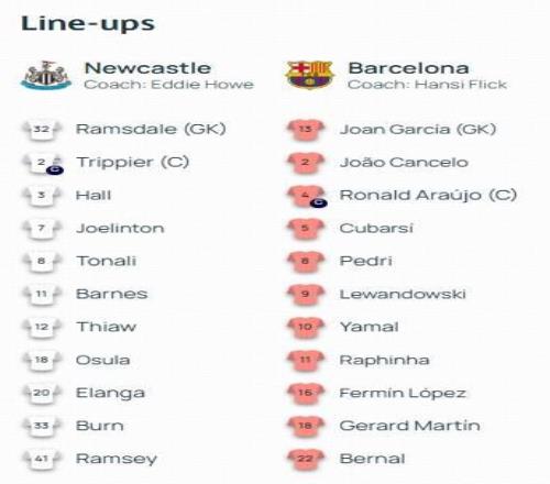 巴萨首发:13-霍安-加西亚、18-赫拉德-马丁、5-库巴西、4-阿劳霍、2-坎塞洛、22-马克-贝尔纳尔、8-佩德里、11-拉菲尼亚、16-费尔明-洛佩斯、10-亚马尔、9-莱万多夫斯基