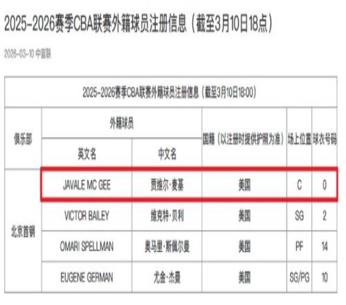 北京时间3月10日,CBA官方公布最新外援注册情况,北京男篮已经为前NBA3冠中锋麦基完成注册,他将身穿0号球衣征战CBA第二阶段的比赛,有望在3月11日对阵四川男篮的比赛迎来加盟首秀。
