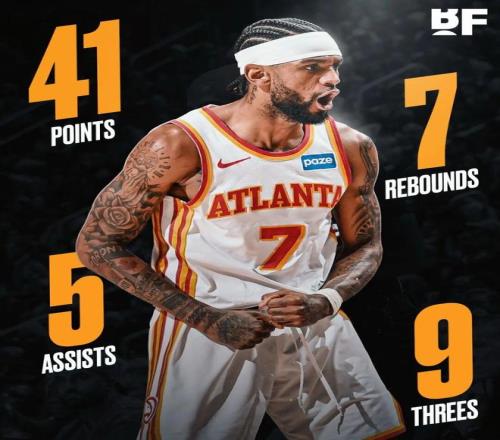 这场比赛,老鹰二当家亚历山大沃克打出了生涯之夜:全场出战37分钟,投篮21中12,三分14中9,罚球9中8,拿下41分7篮板5助攻2抢断。