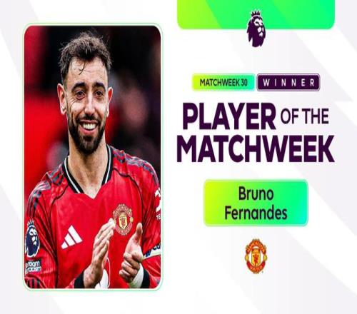 布鲁诺-费尔南德斯在上周末曼联3-1战胜维拉的比赛中完成助攻梅开二度,被球迷评为本轮最佳球员。