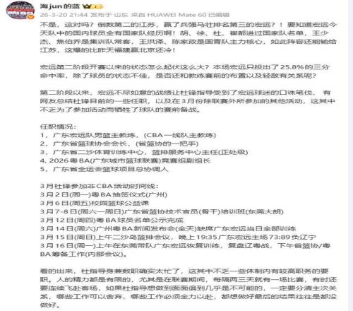 更深层的问题,是杜锋的精力分散。媒体人“海jun的蓝”披露,其身兼五职:广东宏远主教练、广东省篮协会长、二沙中心篮排服务中心主任、粤BA竞赛组副组长、省全运会篮球总协调人。仅三月,他便参与粤BA抽签、公益课、技术培训、新闻发布会等多场活动,甚至在3月14日缺席球队全天训练,次日即遭遇73-89负于辽宁。