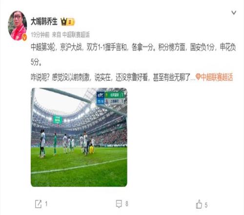 前央视名嘴韩乔生则是在个人社媒这样写道:“中超第3轮,京沪大战,双方1-1握手言和,各拿一分。积分榜方面,国安负1分,申花负5分。咋说呢?感觉没以前刺激,说实在,还没京鲁好看,甚至有些无聊了…”