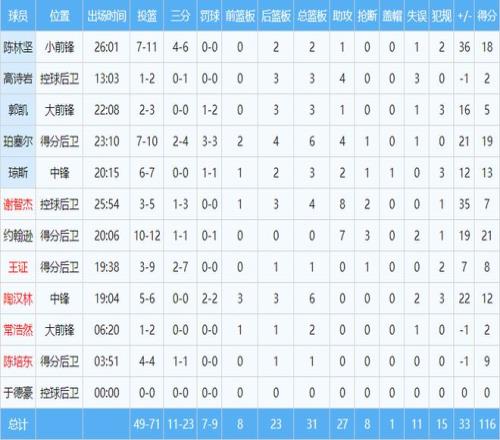 本场比赛,山东队共有11名球员出场,全部有得分进账,其中有5人得分上双。约翰逊12投10中,高效砍下全场最高的21分和7助攻3抢断。珀塞尔贡献19分6篮板4助攻的全面数据。陈林坚三分球6中4,得到18分。琼斯13分,陶汉林12分6篮板。小将王证得到8分,常浩然2分2篮板。