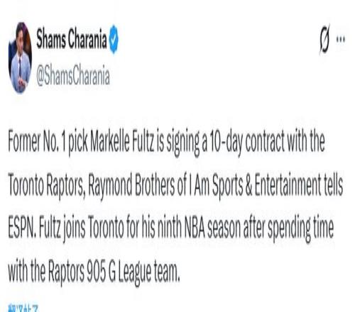 北京时间3月24日,据名记Shams报道,2017年NBA选秀状元富尔茨将与猛龙签一份10天短合同。