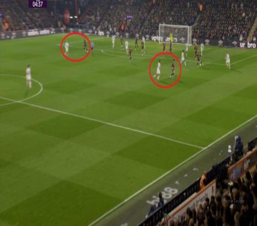 那么在这场比赛,曼联的弱点是如何暴露出来的?其实就发生在第27分钟这次高位逼抢,伯恩茅斯分到边路之后,库尼亚稍微松懈一点点,他们就成功抢到了卡塞米罗的身前,从而制造了他的黄牌:
