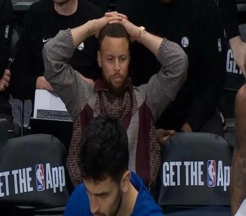 转播方不敢再给特写,信号直接切走,场边库里双手抱头,眉头紧锁,面色铁青,戴上了痛苦面具。