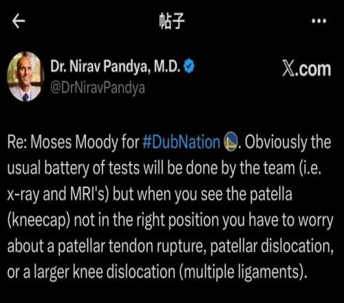 赛后勇士记者Nick Friedell报道,穆迪目前已经从X光检查室中出来,膝盖上戴着厚厚的护具,在队医的陪同下拄拐一瘸一拐返回了更衣室。