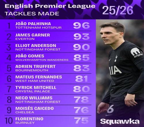 北京时间3月24日,知名数据机构Squawka统计出了本赛季至今英超成功抢断次数最多的10名球员,帕利尼亚96次第1,詹姆斯-加纳93次第2,埃利奥特-安德森90次第3,莫伊塞斯-凯塞多上榜。