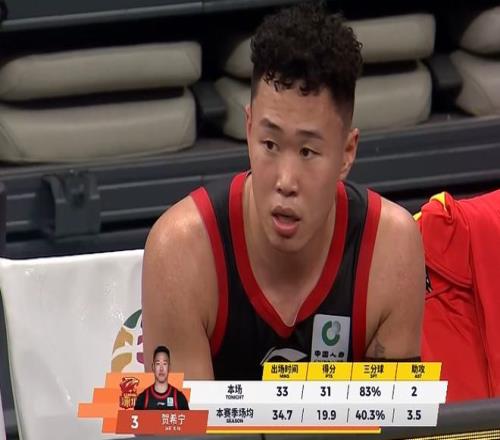 上半场比赛贺希宁7投6中拿到了14分,进入下半场贺希宁全面爆发,第三节比赛单节5投4中拿到了10分,无论是投篮还是持球突破上篮都非常果断且自信,投进一记精彩的三分球后贺希宁还做出了开心的庆祝动作。