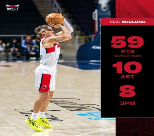 其中面对老鹰下属球队科利帕克天鹰队的比赛,麦克朗全场出战44分钟,投篮34中18,三分18中9,罚球5中5,拿下了54分7篮板10助攻。