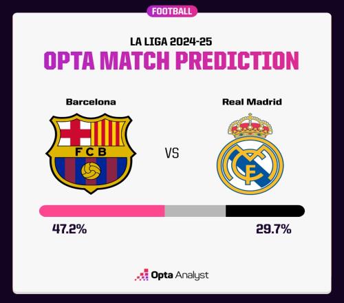 机构预测巴萨本轮取胜概率为47.2%,皇马胜率为29.7%,两队战平概率为23.1%。