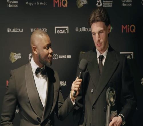 阿森纳球员赖斯当选了伦敦足球奖年度最佳球员,颁奖典礼后接受了采访。德克兰把奖杯抱得很紧。英超年度最佳球...