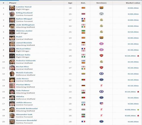 3月9日,英超球员身价更新,萨卡降至1.2亿欧,帕尔默降至1亿欧,索博涨至1亿欧,伊萨克下跌2000万欧,身价来到1亿欧。英...