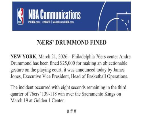 北京时间3月22日,NBA官方公布了两笔罚单,76人球员德拉蒙德做出冒犯性手势,魔术球员萨格斯向观众扔牙套,两人均被...