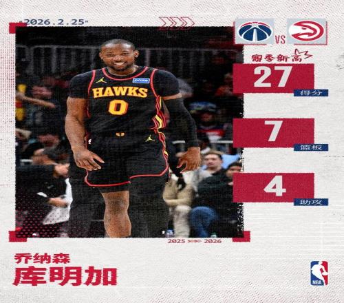 体育播报2月25日宣 NBA常规赛,老鹰主场119-98战胜奇才。本场比赛,老鹰新援乔纳森·库明加迎来首秀,他替补出战2...
