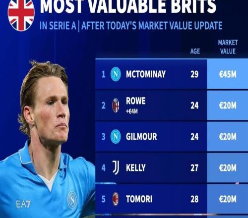 意甲英国球员德转身价榜:麦克托米奈4500万欧元第1
