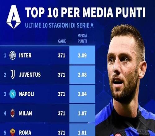 意甲近10年场均积分:国米2.09分第1,尤文第2,米兰第4