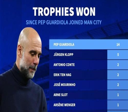 自接手曼城以来瓜迪奥拉14次夺冠,同期英超所有教练第一