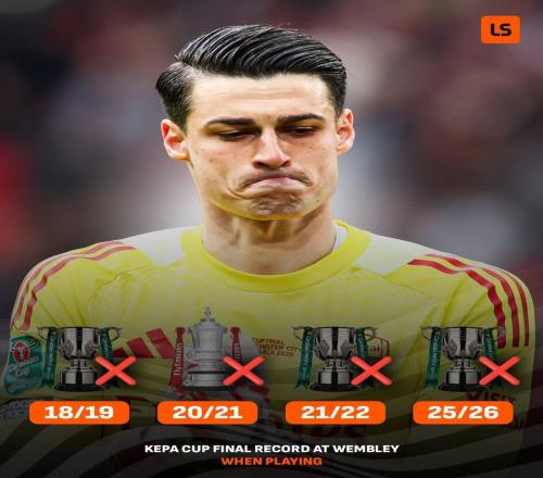 2026年英联杯决赛,阿森纳0-2不敌曼城,至此,阿森纳门将凯帕在温布利4次出战杯赛决赛全部失利。此役在温布利球场...