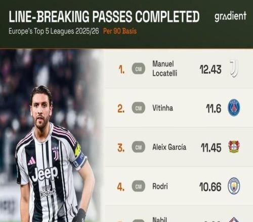 本赛季五大联赛球员每90分钟穿透性传球排行榜:洛卡特利第1