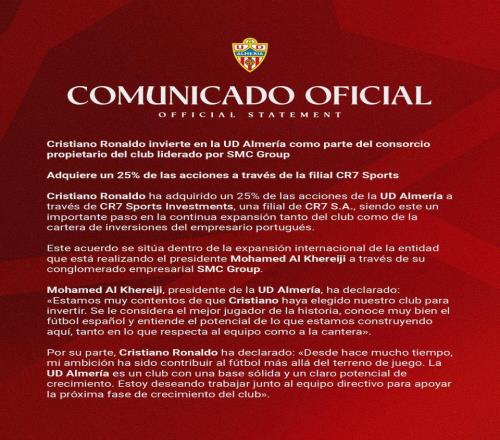 2月26日,西乙球队阿尔梅里亚队在官方宣布,C罗通过其公司CR7体育投资公司,收购球队25%股份。阿尔梅里亚在官方公...