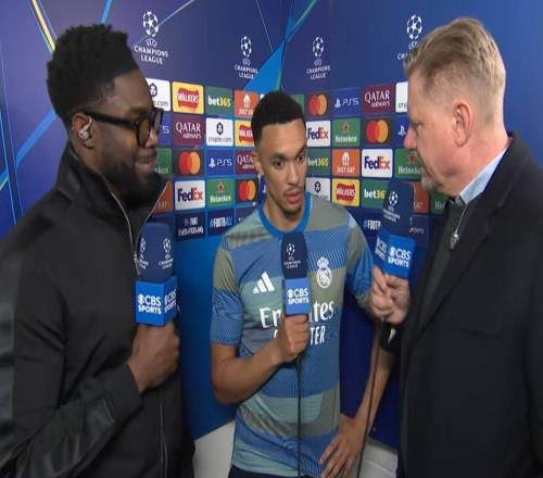欧冠1/8决赛次回合,皇马客场2-1战胜曼城,皇马后卫阿诺德赛后接受了CBS体育的采访。我们现在和特伦特在一起,而...