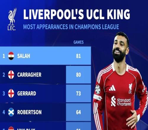 德转统计利物浦队史欧冠出场数前10:萨拉赫81场超卡拉格排第1